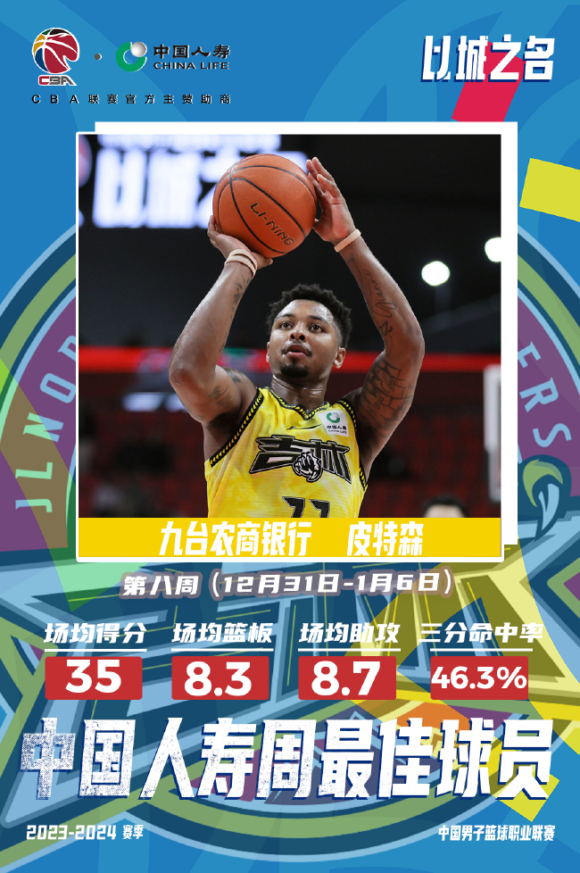皮特森在本周先后带队战胜了辽宁男篮和浙江男篮,为吉林队再次完成连续爆冷。选周过去一周,人本荣皮特森场均轰下35分8.3个篮板和8.7次助攻。此殊