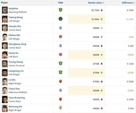 中超身价榜:王钰栋上涨至150万欧 列中国球员第二